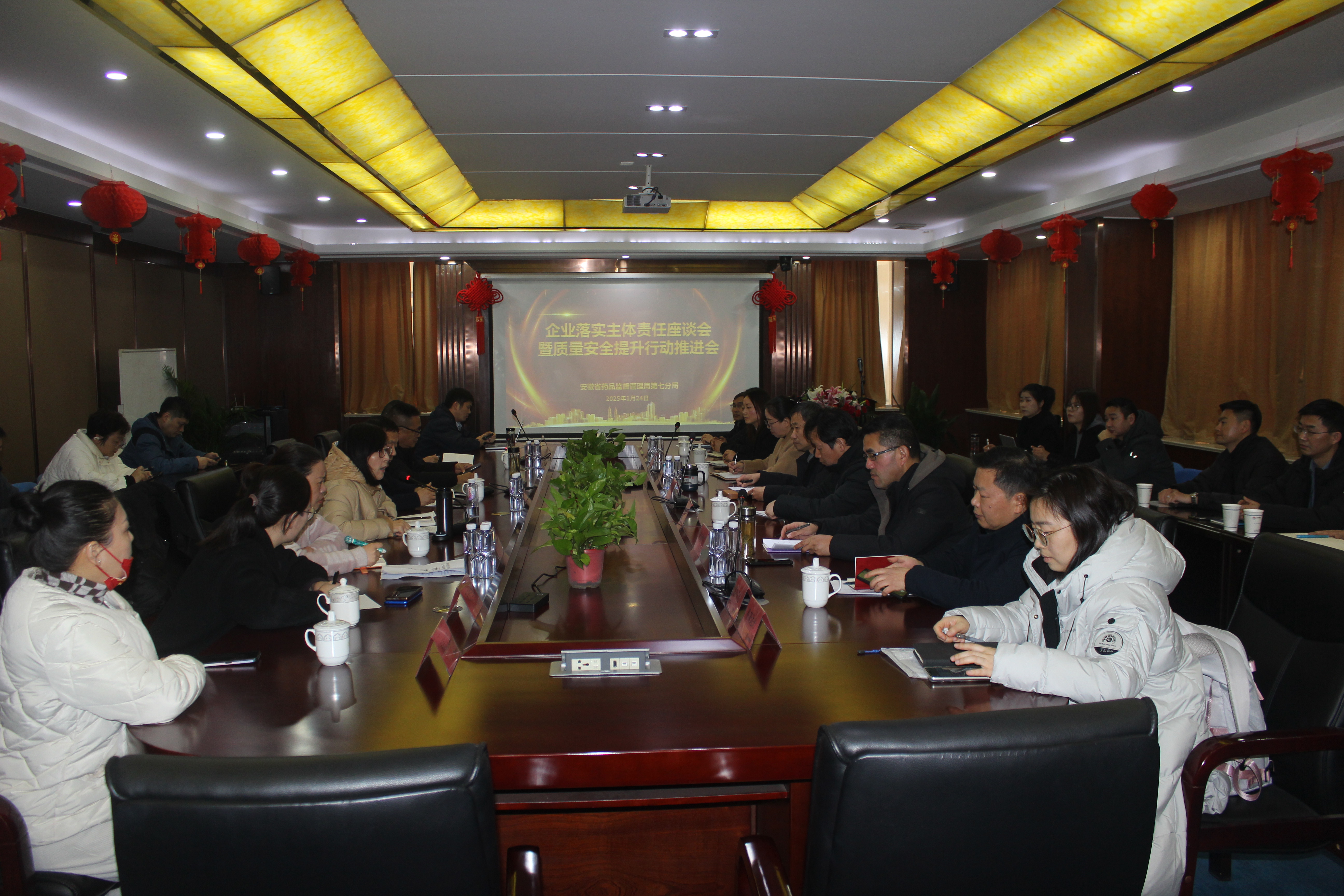為進一步落實企業質量安全主體責任,提升藥械化企業質量安全水平,促進銅陵醫藥產業高質量發展,2025年1月24日下午省藥品監管局第七分局及銅陵市藥械化企業負責人、質量負責人在公司會議室內召開“企業落實主體責任座談會暨質量安全提升行動工作推進會”。參加會議的有省藥品監管局第七分局虞舜來局長、倪敏處長。座談會由第七分局甘傳會科長主持。