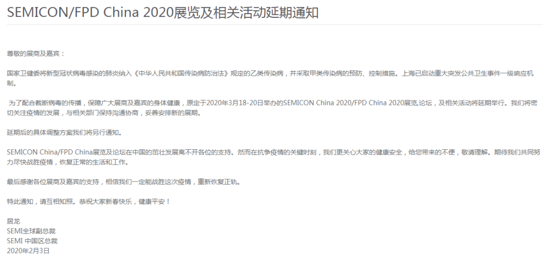 原定于3月18-20日在上海新國際博覽中心舉辦的“SEMICON China 2020國際半導體展” 與原定于2月5日至7日在韓國COEX首爾會議中心舉辦的韓國首爾國際半導體工業技術展覽會(SEMICON Korea 2020)宣布延期舉辦。具體時間安排將另行通知。