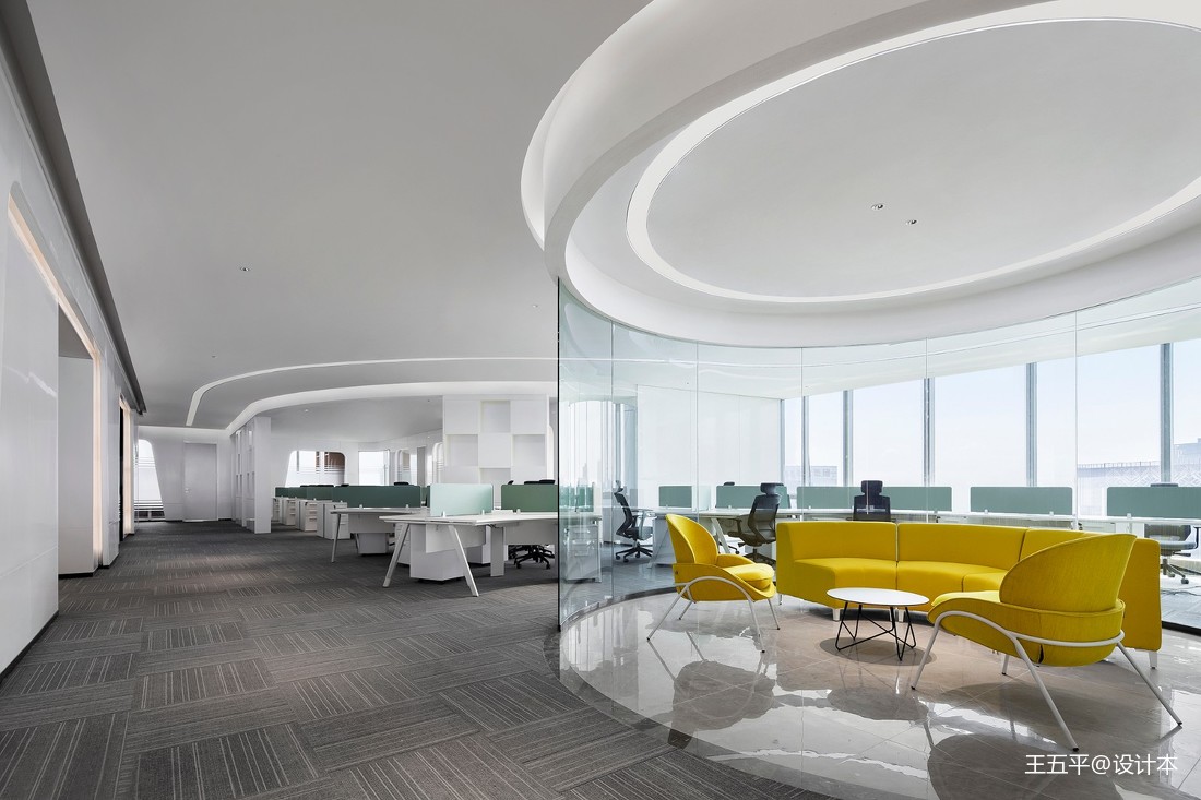 俯瞰空間,光陰交織,線面糅合。曲線元素打破呆板和無(wú)趣,賦予空間多變性?;《缺尘熬徑饪臻g突兀感,將空間柔化,并貫穿空間每一個(gè)角落。簡(jiǎn)單而充滿未來(lái)感的燈具,在低調(diào)中,卻成為另一亮點(diǎn),迸發(fā)著設(shè)計(jì)師的創(chuàng)意與靈感。開(kāi)放式的空間,辦公、洽談或是端詳風(fēng)景,洋溢著的高端與時(shí)尚,溢于言表。